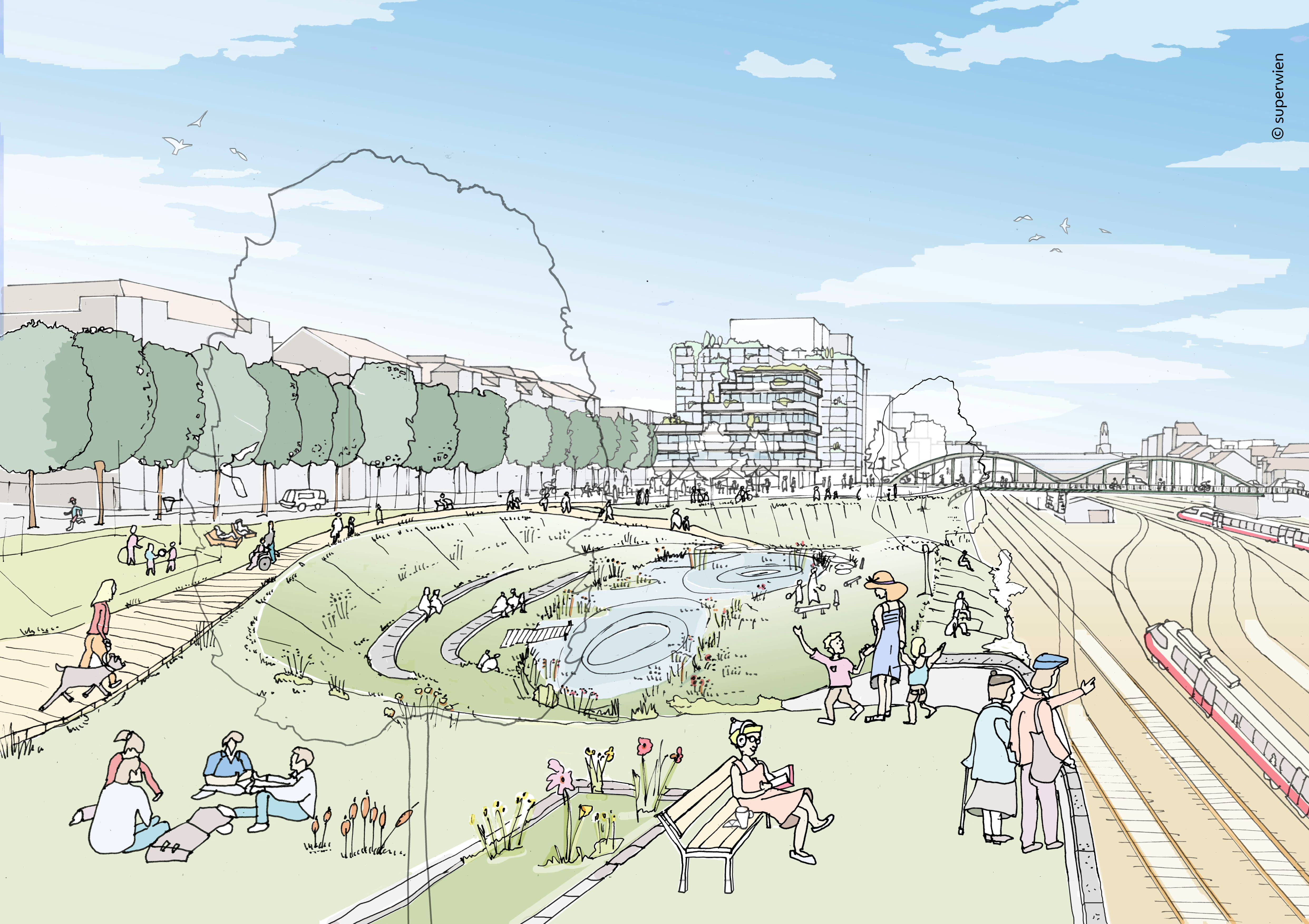 Ziel ist, bis 2028 ein städtebauliches und freiraumplanerisches Leitbild zu erarbeiten. Der Prozess beinhaltet einen Dialog-Tag, eine Quartierswerkstatt, eine Dialogradtour und eine Ausstellung der Ergebnisse. Der geplante Park wird barrierefrei zugänglich sein und vielfältige Angebote für Erholung, Kultur und Sport bieten. Dabei wird er teilweise auf die Felberstraße angehoben zwecks klarer Trennung zum Bahnverkehr, während unter den erhöhten Grünflächen Platz für den Bahnbetrieb und gewerbliche Nutzung geschaffen wird. Große Bäume sollen dort mit Hilfe von Erdüberdeckungen gedeihen.