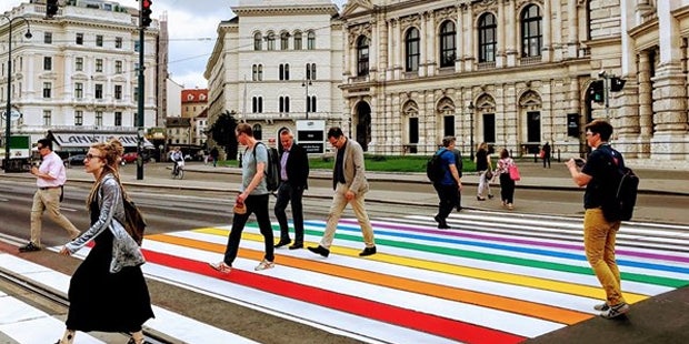 Anlässlich der EuroPride in Wien hat die Stadt ihren ersten Regenbogen-Schutzweg bekommen. Vor dem Burgtheater wurden in der Nacht auf Donnerstag die Zwischenräume des Zebrastreifens in den LGBT-Farben ausgemalt. Die Bemalung wird auch nach der EuroPride bestehen bleiben. "Als Signal der Toleranz und Weltoffenheit", hieß es aus dem Büro von Planungsstadträtin Maria Vassilakou (Grüne).