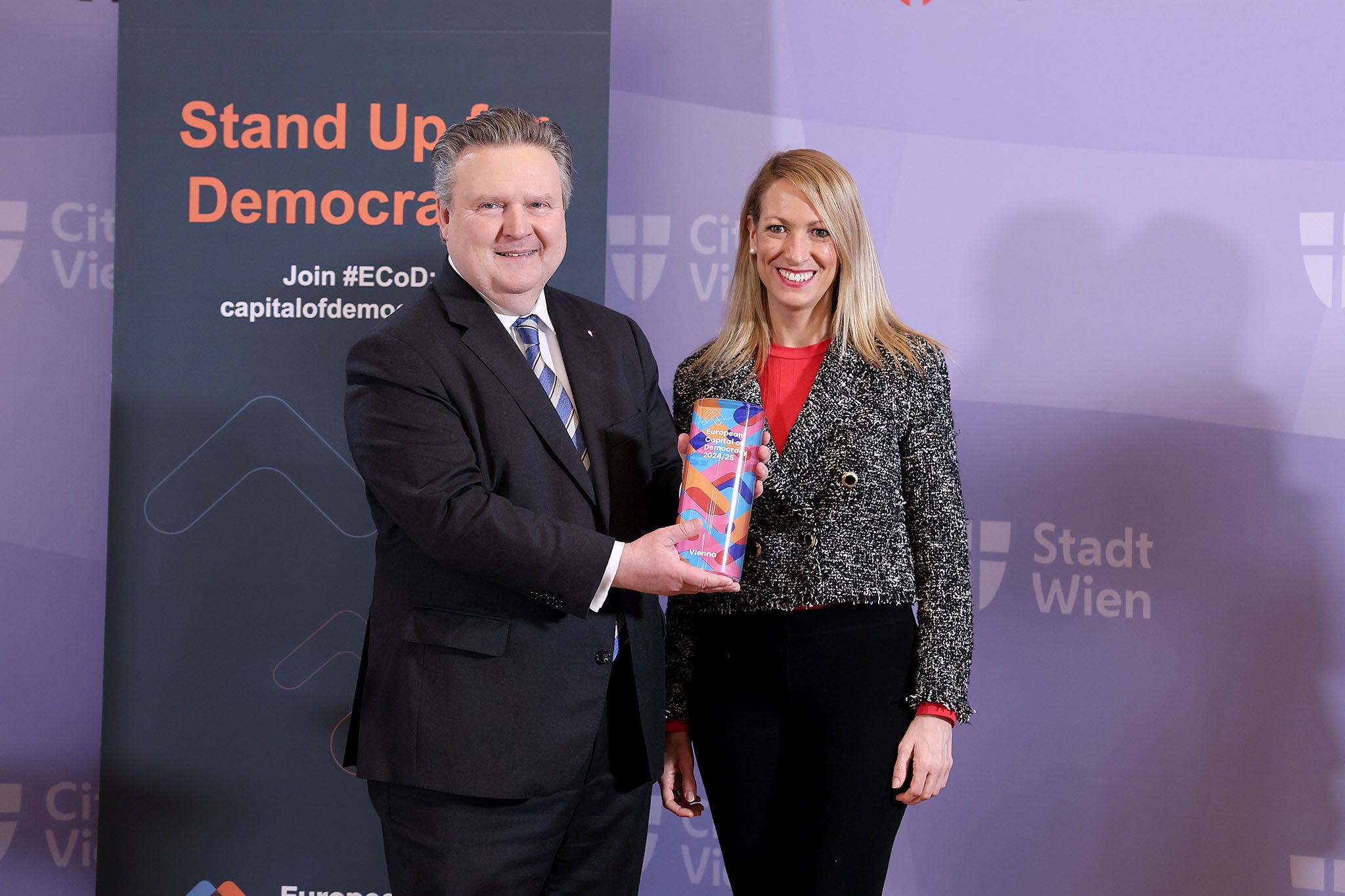 Bei der Übernahme der offiziellen Gewinnertrophäe war auch die Vizebürgermeisterin von Barcelona, Maria Eugénia Gay anwesend. Stadtrat Jürgen Czernohorszky stellte die Schwerpunkte des Programms im Wiener Demokratiejahr vor.