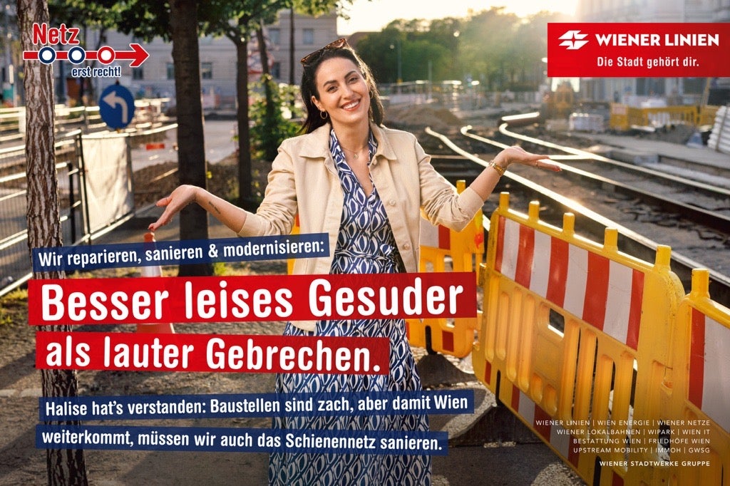 Die Idee hinter der Kampagne: Baustellen sind notwendig, damit Wien in Bewegung bleibt. Zwar sorgen sie selten für Begeisterung, doch die Wiener Linien zeigen mit Humor und Haltung, dass man trotzdem darüber schmunzeln kann. So lässt sich auch notwendige Infrastrukturmodernisierung kommunikativ auf den Punkt bringen: „Besser leises Gesuder als lauter Gebrechen.“
