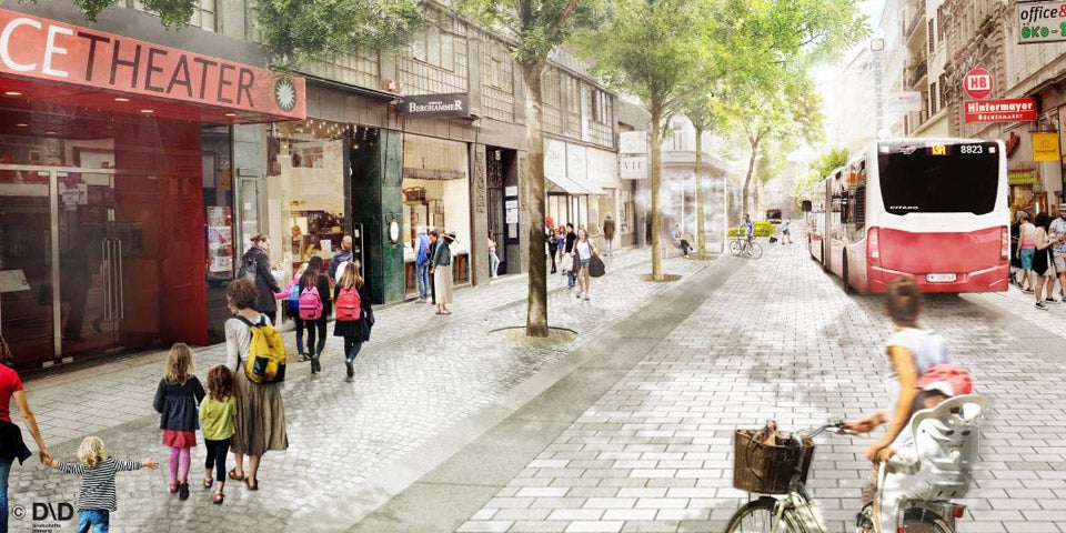 Niveaugleiche Pflasterung, Bäume, Sprühnebel und keine Stellplätze mehr - so soll die neue Neubaugasse aussehen.