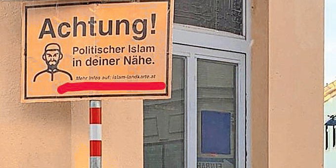 Wien. Eine Aktion im Zusammenhang mit der "Islamlandkarte" der Dokumentationsstelle politischer Islam dürfte wohl für weiteren Zündstoff in der aktuellen Diskussion sorgen. Am Dienstag machten auf Twitter diverse Fotos von selbst gebastelten "Warnschilder" die Runde, die in der Nähe zu islamischen Einrichtungen montiert worden waren. Wer dafür verantwortlich zeichnet, war zunächst unklar.