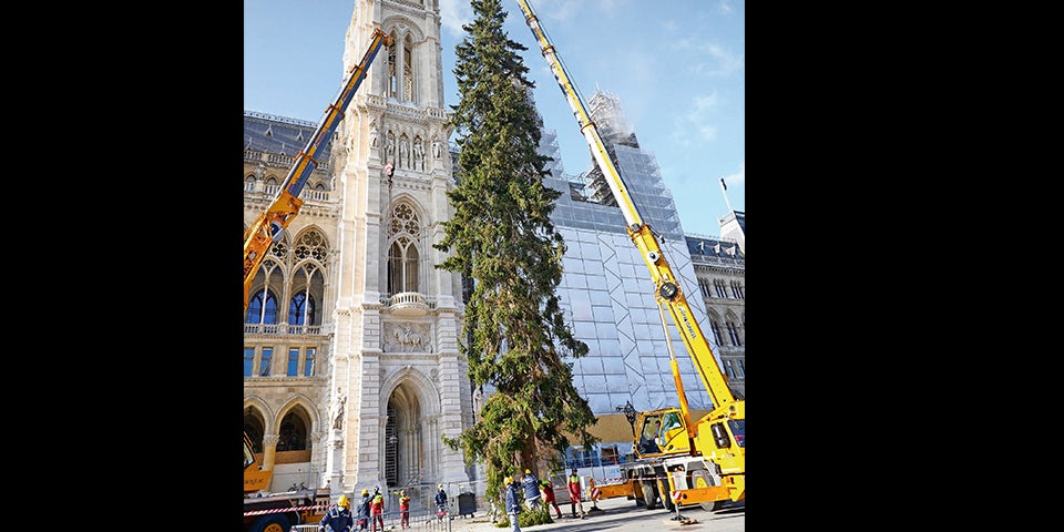 Verschönern. Mit Klettergurt am Stamm gesichert, überprüfen die Baum-Profis in mehr als 30 Metern Höhe jeden Ast und füllen Lücken mit Fichtenästen, damit er gleichmäßig ausschaut. Mehr als 150 Äste werden zum Ausbessern dort eingesetzt, wo der 33 Meter hohe Baum beim Fällen und durch den Transport Äste verloren hat. „Wegen des Anschlags konnte der Baum nicht – wie geplant – am Dienstag aufgestellt werden, sondern lag am Sattelschlepper. Schäden durch Transport und Fällen sind unvermeidbar“, erklärt eine Sprecherin von Wien Marketing: „Wir haben noch jeden Baum wunderschön aussehen lassen.“