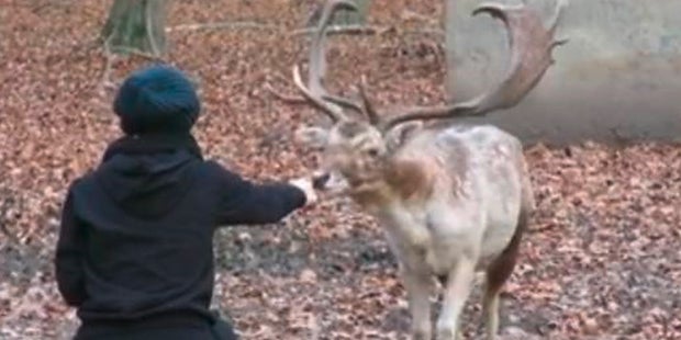 Dieses Video wurde bereits 600 Mal auf Facebook geteilt. Darauf zu sehen ist eine Frau, die sich hinhockt und einem offensichtlich handzahmen Hirsch über den Kopf streichelt. Das Tier schnuppert nur kurz und geht gemütlich seiner Wege. Gefilmt wurden diese Szenen vom Obmann des Vereins gegen Tierfabriken (VGT), Martin Balluch.