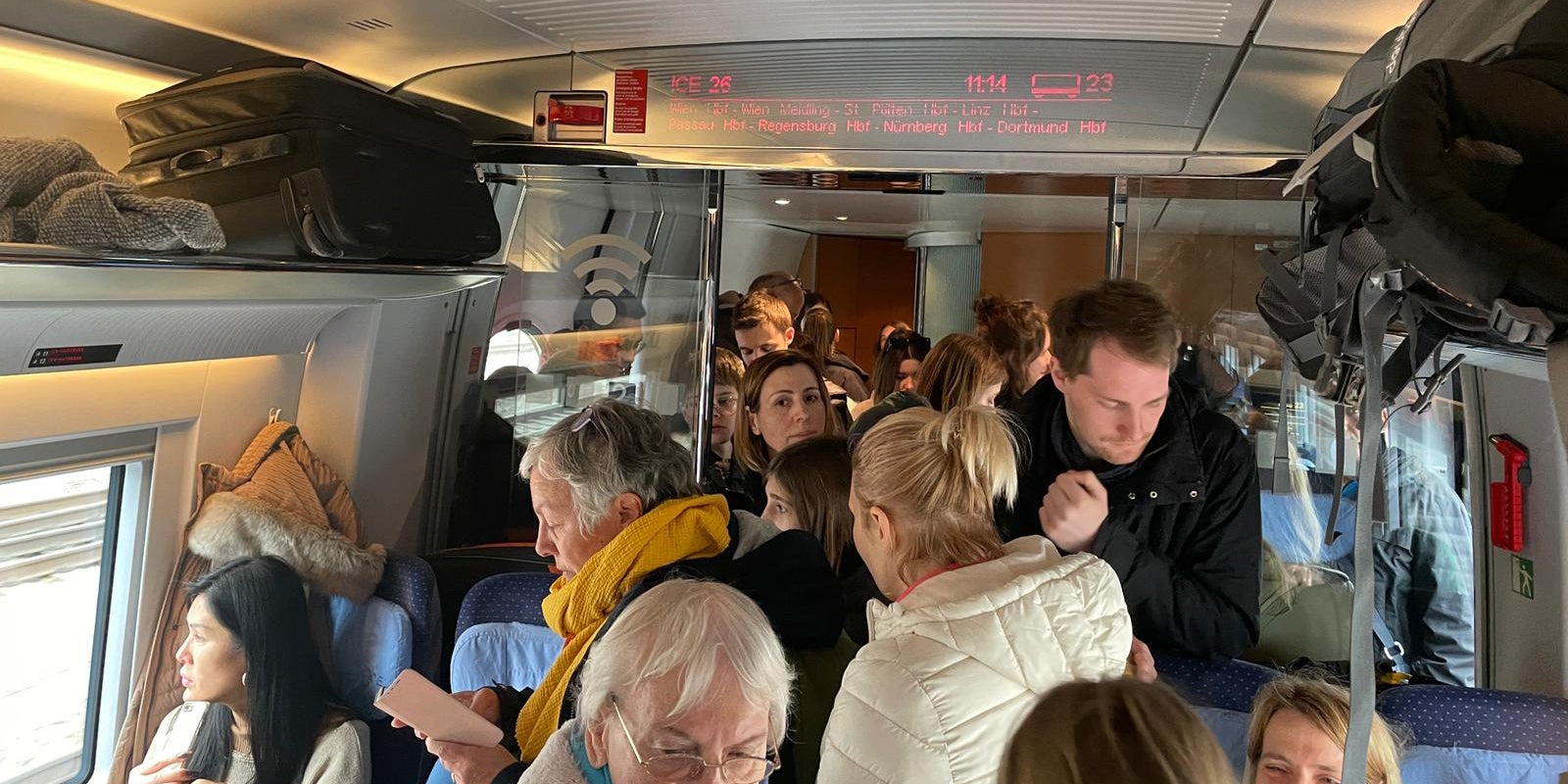 Am Ostersonntag fiel heute ein Zug von Wien Hbf Richtung Nürnberg aus. Die Passagiere warteten auf den nächsten Zug, der dann heillos überfüllt war.