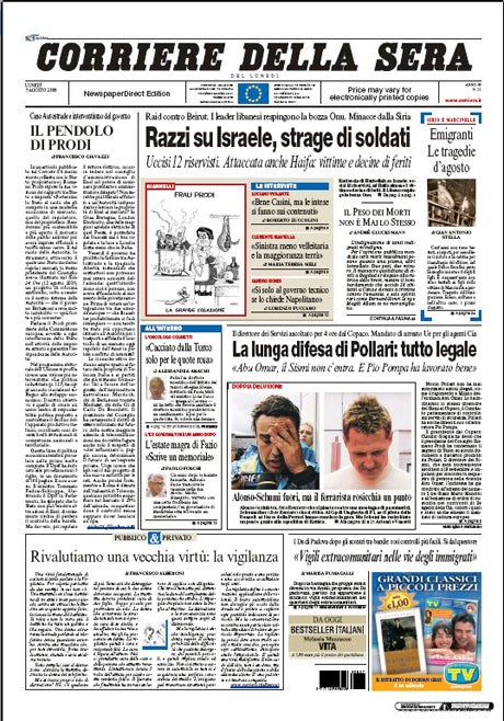 oe24.at Inland Italien Corriere della Sera 07.08.06, 10:17 | Aktualisiert: 12.07.10, 18:31 Teilen 07.08.2006 Corriere della Sera: Titelseite vom 07.08.2006 © oe24 Fehler im Artikel gefunden? Jetzt melden. Die Top-Stories vom oe24 E-Paper EU-Parlament blockiert Mercosur-Abkommen Das steckt hinter Bellinghams provokantem Bier-Jubel "Schneewittchen" als Top-Favorit für die Anti-Oscars Eklat im Parlament: "Keine Zähne, zerrissene Hose" Stocker in Davos: Treffen mit Kurz und Selenskyj Bandenkrieg in Meidling: Haupttäter kassiert sechs Jahre Haft Totes Baby an Grenzübergang: Mädchen wurde getötet Putin trifft am Donnerstag US-Sondergesandten Witkoff ESC-Hit: ER gewinnt den Song Contest in Wien!