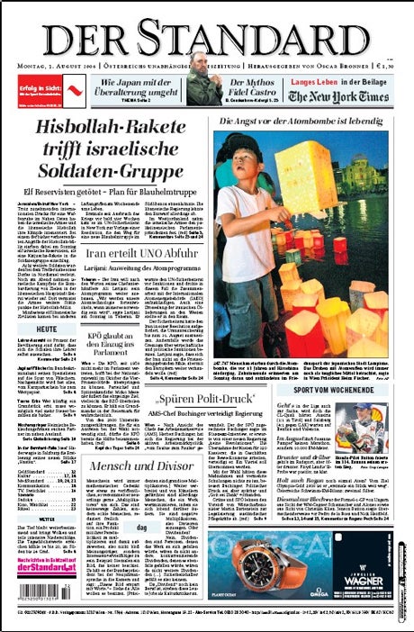 oe24.at Inland Österreich Der Standard 07.08.06, 08:53 | Aktualisiert: 12.07.10, 18:31 Teilen 07.08.2006 Der Standard: Titelseite vom 07.08.2006 © oe24 Fehler im Artikel gefunden? Jetzt melden. Die Top-Stories vom oe24 E-Paper DIESER berühmte Promi-Spross soll zum Opernball kommen Große Trauer in der Steiermark: Johanna G. wird verabschiedet 250.000 Euro gewinnen: So funktioniert das Regierungs-Lotto SO luxuriös urlaubt Verleger Mucha auf den Malediven Teenie-Bande nach iPhone-Coup geschnappt - jüngster Täter erst 12! DARUM explodieren die Kurse für Gold und Silber Mehrwertsteuer-Senkung: Bablers Warenkorb doch noch nicht fix Senta Berger (84) schwer gestürzt: Große Sorge um Schauspielerin