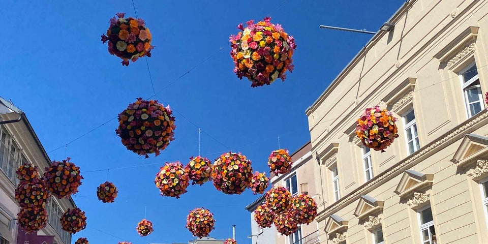 Sie müssen sich keine Sorgen machen: Hierbei handelt es sich nicht um eine weitere Corona-Mutation, mit Viren, die plötzlich zur Fußball-Größe anschwellen und knallig bunt durch die Fußgänger-Zone von Wels schweben. Hier haben wir es lediglich mit einer blumigen Frühlingsdeko zu tun. Bei genauerem Hinsehen wird es auch klar, dass es sich hierbei um Blumenarrangements handelt. Allerdings erst auf den zweiten Blick...