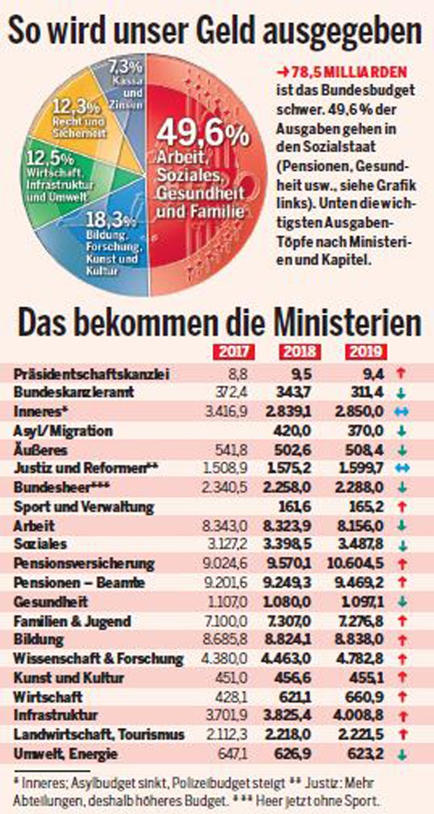 ■ Pensionen: Der Finanzminister forderte Maßnahmen im Pensionsbereich: „Ich appelliere an alle Mitglieder des Hohen Hauses, dieses Thema ernst zu nehmen.“ Tatsächlich kosten die Renten 2018 und 2019 jeweils rund 20 Milliarden.
