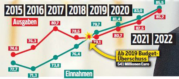 Nun, bescheiden war sie nicht, die erste Rede. Löger lobte seinen Entwurf in höchsten Tönen: Erstmals seit 65 Jahren werde es 2019 einen echten Überschuss im Bundesbudget geben – und zwar sollen es konkret 541 Millionen Euro sein. Lögers Vorgänger Karl Heinz-Grasser hatte sein „Nulldefizit“ nur mit Überschüssen aus den Ländern geschafft. Jetzt ist es der Bund, der schwarze Zahlen schreibt.