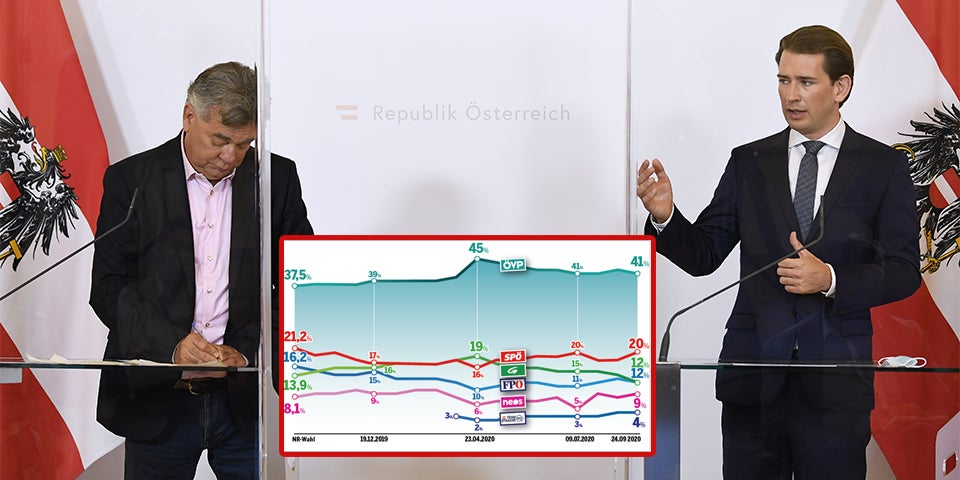 ■ Sonntagsfrage: Aus den 37,5 % der Wahl 2019 sind für die ÖVP aktuell 41 % geworden, die Koalition hat Kurz also genutzt. Allerdings: Den Höhepunkt hatten die Türkisen während des Corona-Lockdowns mit 45 %. Woher diese Prozente kommen, ist klar: von der FPÖ. Sie hatte am 29. September 2019 noch 16,2 % – und jetzt nur 12. Und die Grünen? Sie konnten nach der Koalitionsbildung im Frühjahr die SPÖ überholen, erreichten als Spitzenwert 19 %. Doch die Rolle als Juniorpartner und Polit-Niederlagen (Moria-Kinder!!) zeigen ihre Wirkung: 12 % sind weniger als vor einem Jahr.