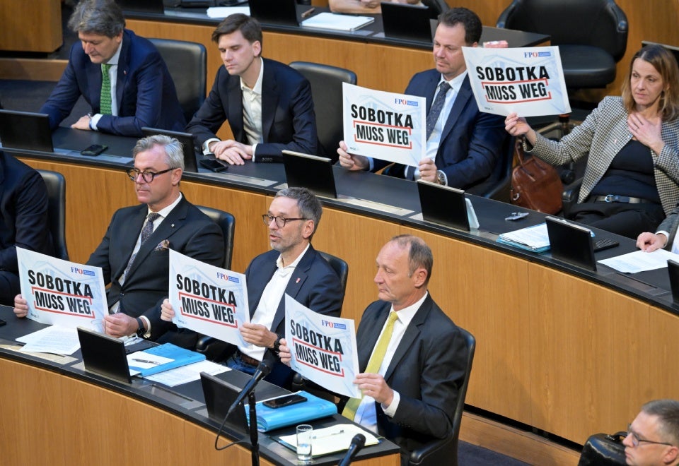 Die FPÖ drückte ihren Rücktrittswunsch an Sobotka mit Tafeln aus. Das Schild "Sobotka muss weg" hielt neben anderen sogar der Dritte Präsident Norbert Hofer (FPÖ) in der Hand.