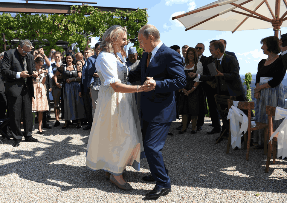 Die Bilder der Hochzeit in der Südsteiermark, auf denen Kneissl mit ihrem Stargast Putin das Tanzbein schwingt und einen tiefen Knicks vor ihm macht, gingen um die Welt. Bei seiner Ankunft beim Gasthof Tscheppe hatte Putin für die Braut einen Blumenstrauß und einen Don Kosaken-Chor dabei, als weiteres Geschenk ist etwa ein Samowar überliefert. Bisher nicht bekannt war, dass Putin offensichtlich nicht nur bescheidene Hochzeitsgeschenke wie ein Butterfass dargebracht hat: Wie Schriftstücken des Außenministeriums laut Medienberichten zu entnehmen ist, schenkte der russische Präsident der damaligen Außenministerin auch wertvolle Saphir-Ohrringe.