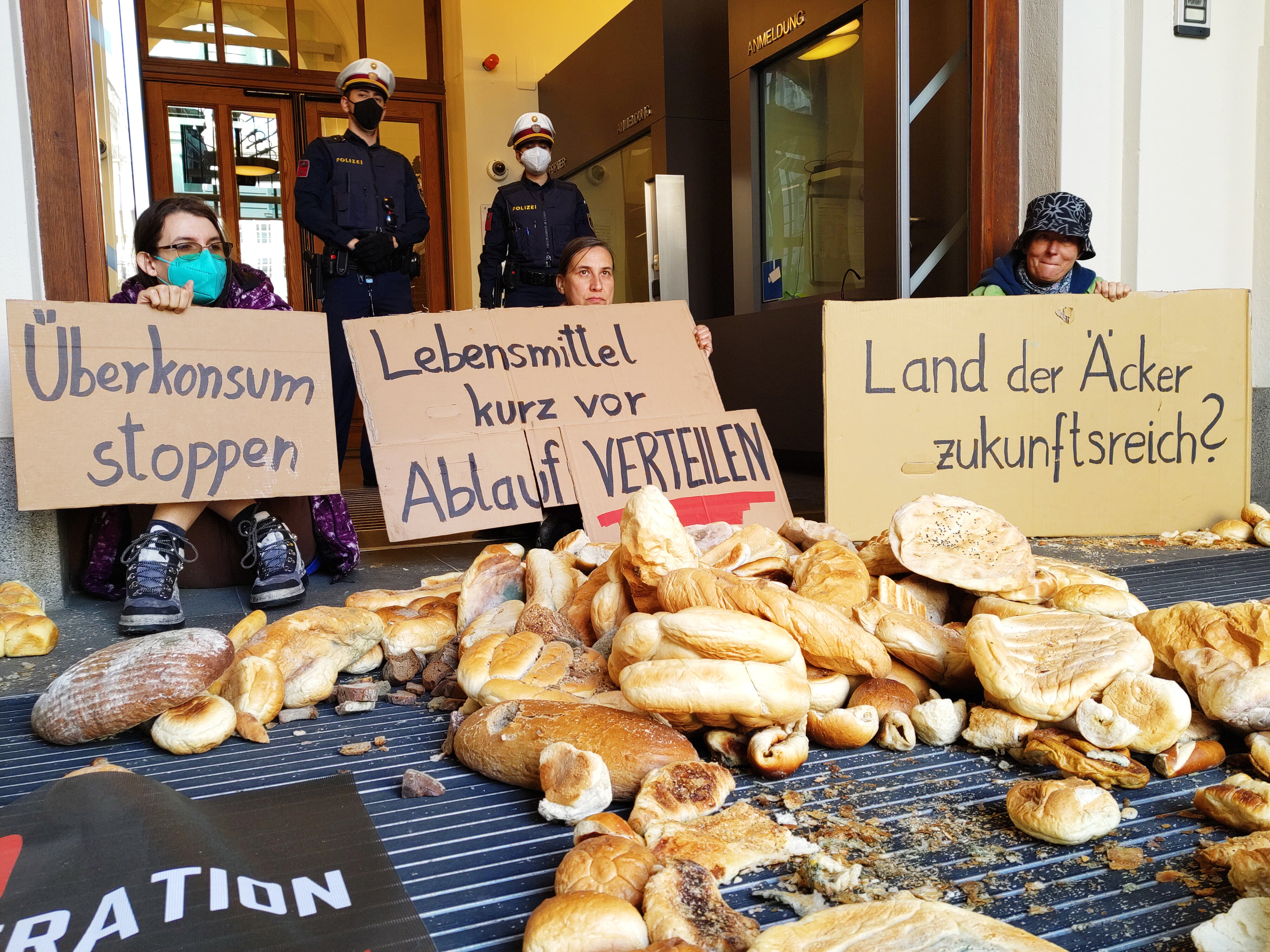 Aktivisten von "Extinction Rebellion" und "Letzte Generation" haben massenweise altes Brot aus der Überproduktion vor den Eingang des Landwirtschaftsministeriums in Wien ausgekippt.