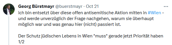 Grünen-Mandatar Georg Bürstmayr zeigt sich auf X (vormals Twitter) entsetzt über die Tat. Er werde unverzüglich der Frage nachgehen, warum sie überhaupt möglich gewesen sei "und was genau hier (nicht) passiert ist." An sich werden jüdische Einrichtungen von Polizei und Heer geschützt, aber offenbar teils nur während ihrer Öffnungszeiten.