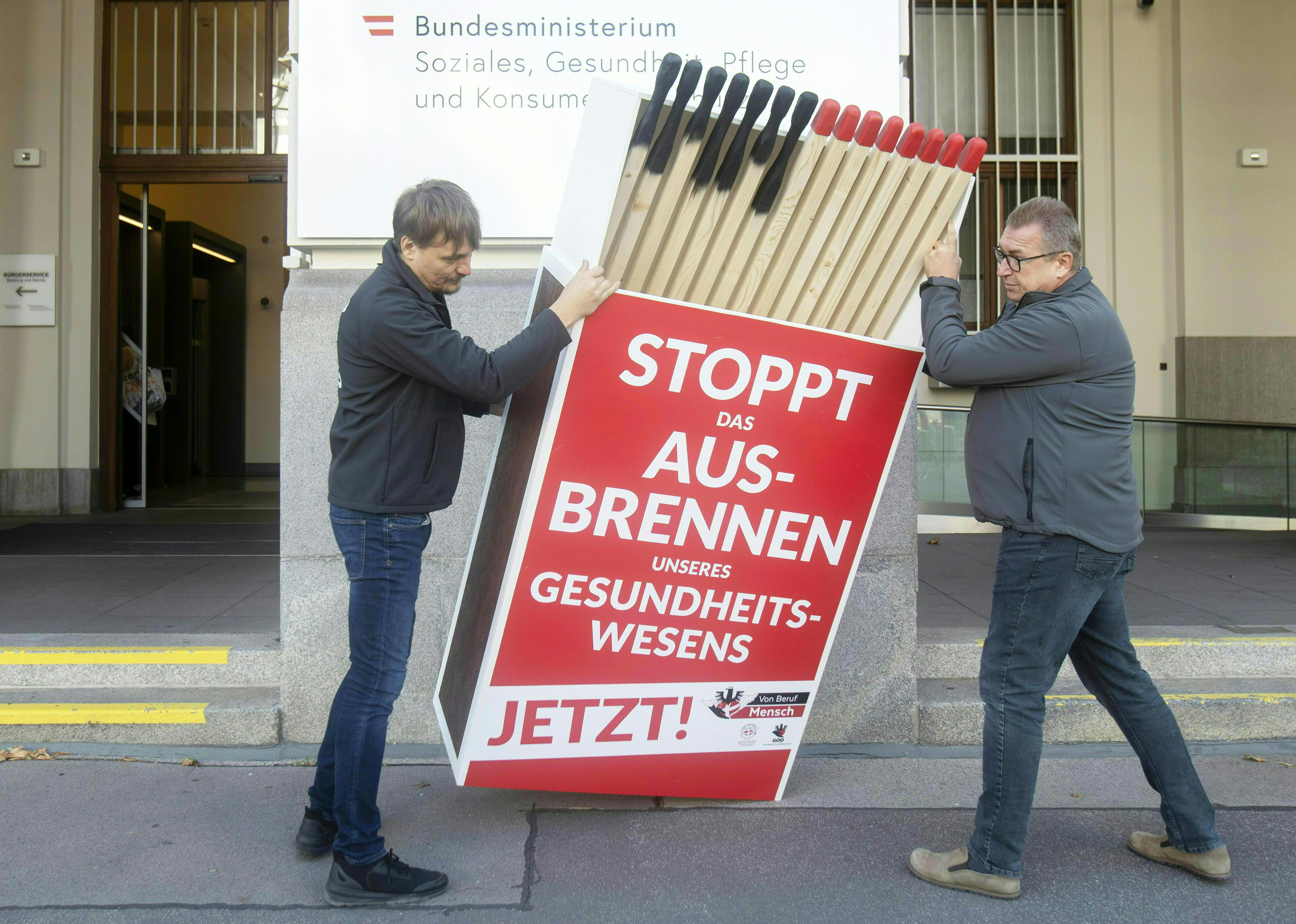 Die Gewerkschaften GÖD und younion haben am Freitag ihre Warnungen vor zunehmenden Personalengpässen in Österreichs Krankenhäusern verschärft. Die Zahl der gesperrten Spitalsbetten sei seit Mai um 24 Prozent auf österreichweit 3.442 gestiegen, hieß es auf der Demo. Dabei wurde eine mannshohe Streichholzschachtel als Symbol für das Ausbrennen des Personals vor dem Gesundheitsministerium aufgestellt.