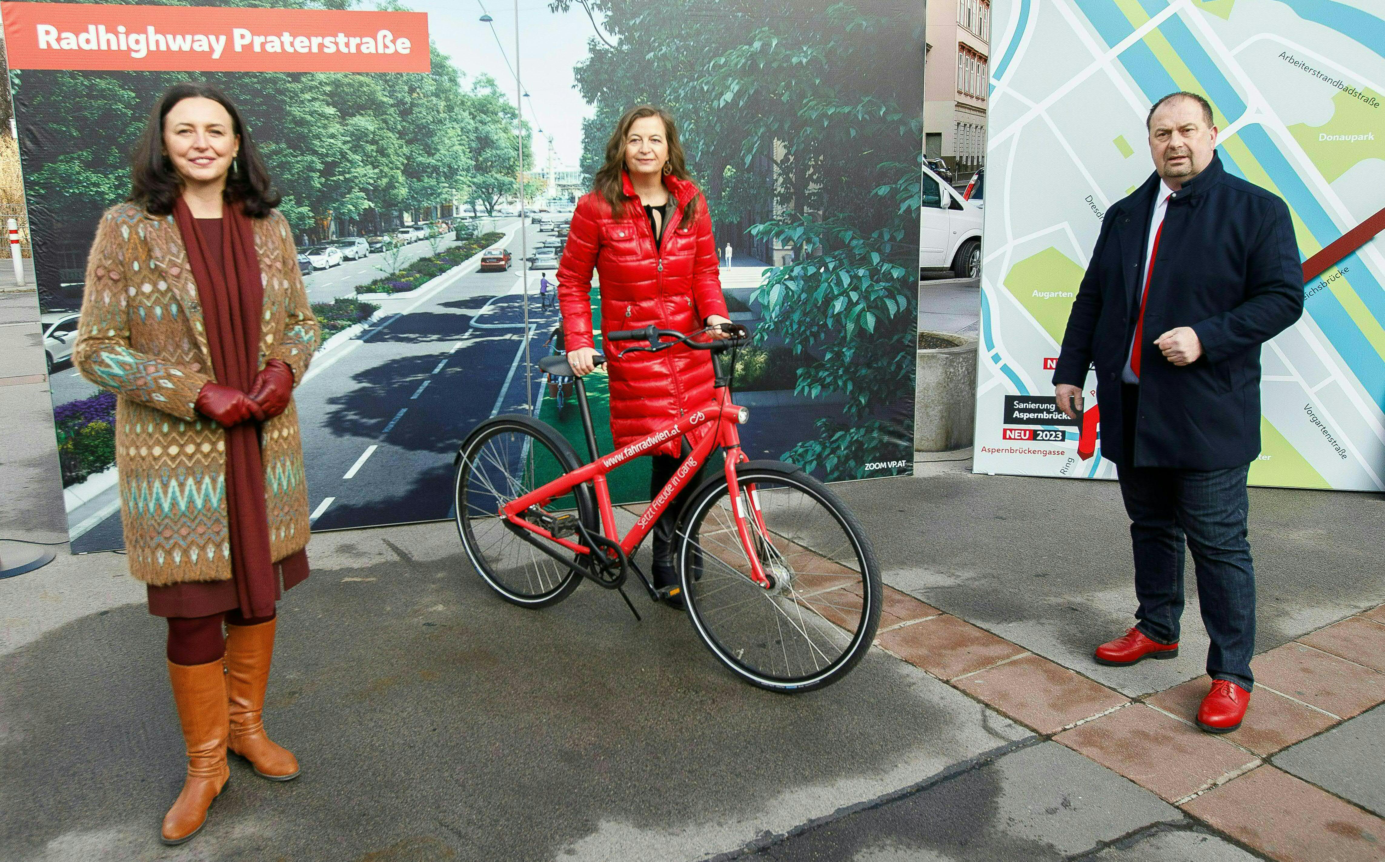 In der Praterstraße und der Aspernbrückengasse wurde pünktlich vor Jahresende die vorletzte Etappe von Wiens erstem "Mega-Radhighway" fertiggestellt. Radfahrerinnen und Radfahrern steht in der Leopoldstadt ab heute ein neuer rund vier Meter breiter Zwei-Richtungs-Radweg zur Verfügung.