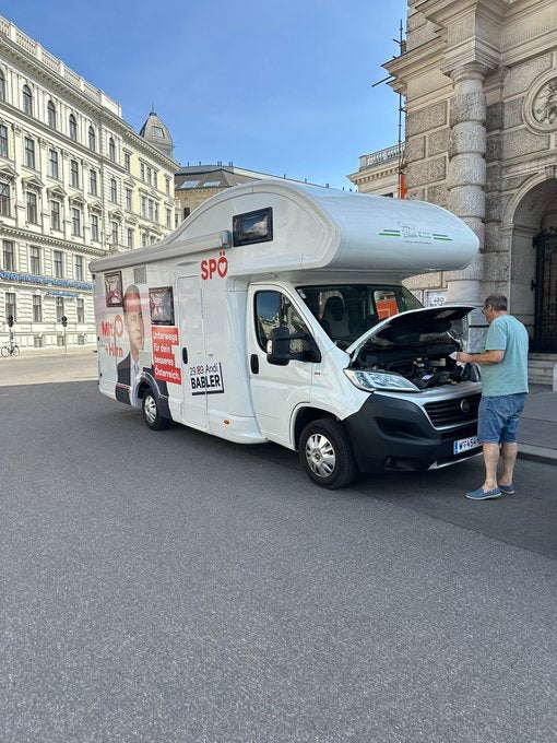 Bablers Wohnmobil kutschierte ihn durch ganz Österreich - teils durch malerische Orte. Die Fotos davon zeigten dann aber beispielsweise den Wagen samt Babler-Team in einem Parkplatz auf dem düsteren Hinterhof, statt vor Sehenswürdigkeiten wie einem Schloss.