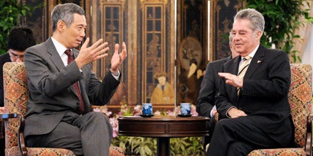 Bundespräsident Heinz Fischer ist am Montag bei seinem Staatsbesuch im südostasiatischen Stadtstaat Singapur mit Präsident S. R. Nathan und Premier Lee Hsien Loong zusammengetroffen und hat dabei versucht, Sorgen abzubauen, der Euro oder die EU befänden sich in existenziellen Schwierigkeiten. Fischer erwartet durch seinen Besuch wichtige Impulse auf politischem, wirtschaftlichem und kulturellem Gebiet. Der Stadtstaat unterstütze die österreichische Kandidatur um einen Sitz im UN-Menschenrechtsrat, sagte Fischer bei einer Pressekonferenz mit österreichischen Journalisten. Beeindruckt zeigte er sich auch von der "Konzentration auf die systematische Förderung von Wissenschaft und Forschung" in Singapur.