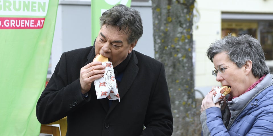 Im Mittelpunkt der kurzen Ansprachen von Petrik und Kogler vor einem riesigen Ball in Form des Planeten Erde standen Klimaschutz und der Ausbau des öffentlichen Verkehrs, der für das Pendler-Bundesland besonders wichtig ist. Für die besten Bilder sorgten aber nicht die Grünen selbst, sondern der Fleischer Otmar Tschürtz, der nach den Ansprachen auf die "Bühne" sprang und Kogler und Petrik Leberkässemmeln vom burgenländischen Mangalitzaschwein in die Hände drückte. "Es ist alles aus dem Burgenland", bewarb der Metzger seine Ware. "Ich sage immer: eine Leberkässemmel ist besser als ein Burger", reagierte Kogler schlagfertig und spielte auf die jüngste Kritik gegen ihn wegen des Besuches eines Fast-Food-Ladens an.