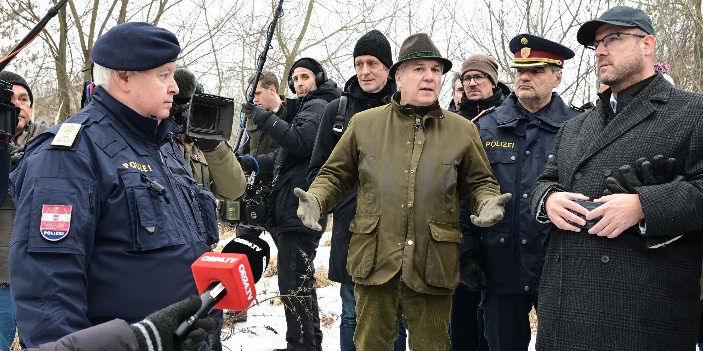 Der Nationalratspräsident Walter Rosenkranz (FPÖ) kam in Jäger-Kleidung und Gummistiefeln, daneben U-Ausschuss-Fraktionschef der FPÖ, Christian Hafenecker. Der U-Ausschuss-Fraktionschef der SPÖ, Jan Krainer, trug eine dicke Haube. Es war sehr kalt.