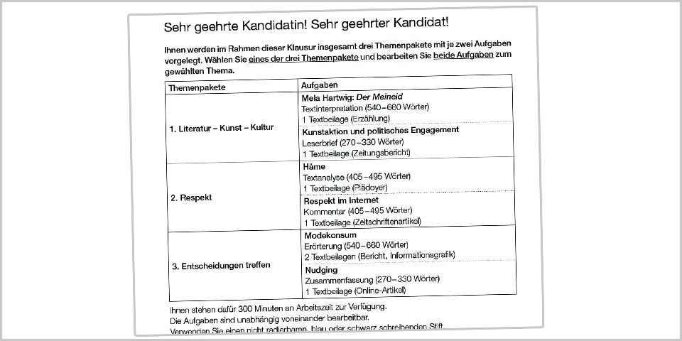 Die Aufgabenstellung für die Deutsch-Zentralmatura: Themenpaket eins trug den Titel "Literatur-Kunst-Kultur" und beinhaltete eine Interpretation von "Der Meineid"(Mela Hartwig) sowie einen Leserbrief. Paket zwei hieß "Respekt" - mit Aufgaben zu "Seid endlich lieb zueinander" und "Respekt im Netz". Das laut einem ÖSTERREICH-Rundruf in mehreren Wiener Schulen beliebteste Paket war Nummer drei: "Entscheidungen treffen". Hier ging es um eine Erörterung zum Thema "Saubere Mode" und eine Textzusammenfassung.