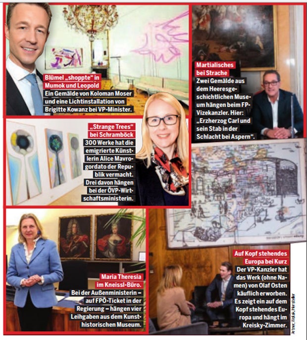 - Karin Kneissl. Die Außenministerin setzt auf Historisches, geliehen vom Kunsthistorischen Museum: konkret Porträts von Maria Theresia, ihrem Mann und ihren Eltern.
