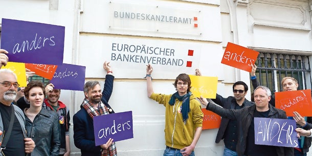 Vor der Abfahrt hat Ehrenhauser mit Parteikollegen noch das Kanzleramt in Wien umbenannt. Weil dort „nicht das Volk, sondern Banken“ vertreten werden würden, sei es viel mehr ein Standort des „Europäischen Bankenverbands“.