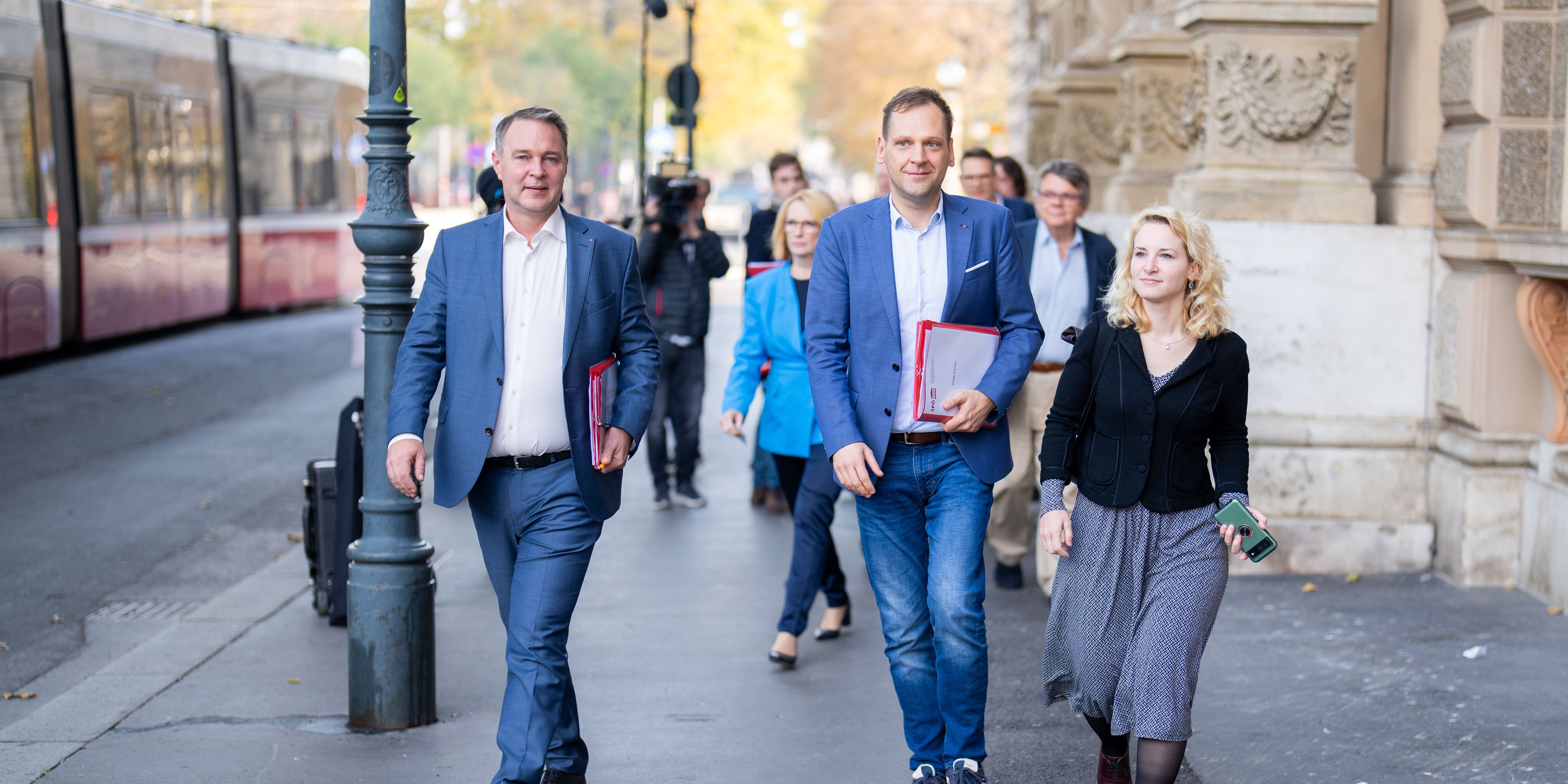 Rund 4,5 Stunden trafen sich die Teams von Volkspartei und Sozialdemokraten im Palais Epstein nahe dem Parlament. Begleitet wurde Babler von Frauenchefin Eva Maria Holzleitner, ÖGB-Präsident Wolfgang Katzian, der Dritten Nationalratspräsidentin Doris Bures, Bundesgeschäftsführerin Sandra Breiteneder und Vize-Klubchef Philip Kucher. Die ÖVP stellt sich mit Nehammer, Generalsekretär Christian Stocker, dem geschäftsführenden Klubobmann August Wöginger, Kanzleramtsministerin Karoline Edtstadler, Wirtschaftskammer-Präsident Harald Mahrer und Staatssekretärin Claudia Plakolm auf.