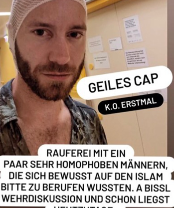 Rammer veröffentliche in den Sozialen Netzwerken ein Foto, das ihn mit einem Kopf-Verband zeigt. Er schreibt dazu: "Rauferei mit ein paar sehr homophoben Männern, die sich bewusst auf den Islam [...] berufen. A bissl Wehrdiskussion und schon liegst heutzutage."