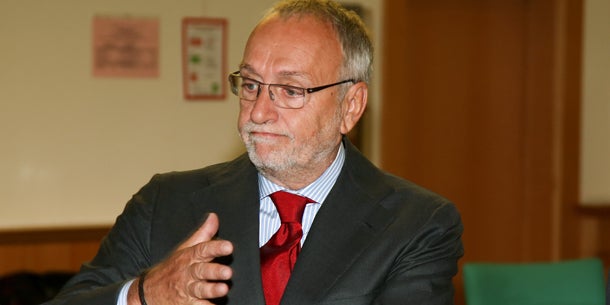 Gernot Rumpold ist da. Braungebrannt, im dunklen Anzug und weißem Hemd.