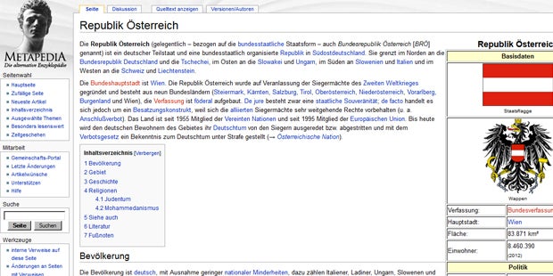 Als zweitbester Treffer wird nämlich ein Artikel der Enzyklopädie Metapedia ausgewiesen. Klickt man darauf, erlebt der User eine Überraschung. Auf der Seite, die Wikipedia zum Verwechseln ähnlich sieht, erfährt man allerlei verstörende Infos über Österreich. So sei das Land ein „deutscher Teilstaat“ und wurde nur auf Veranlassung der Siegermächte des 2. Weltkrieges gegründet.
