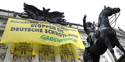 40 Greenpeace-Aktivisten haben Donnerstag früh vom Dach des Umweltministeriums ein 200 Quadratmeter großes Banner mit der Aufschrift "Aufwachen Herr Berlakovich: Stoppen Sie deutsche Schrott-AKW!" entrollt. Damit sollte gegen die "anhaltende atompolitische Untätigkeit des Umweltministers" protestiert werden. Österreich müsse beim Europäischen Gerichtshof Klage gegen die Laufzeitverlängerung der deutschen Atomkraftwerke einreichen.
