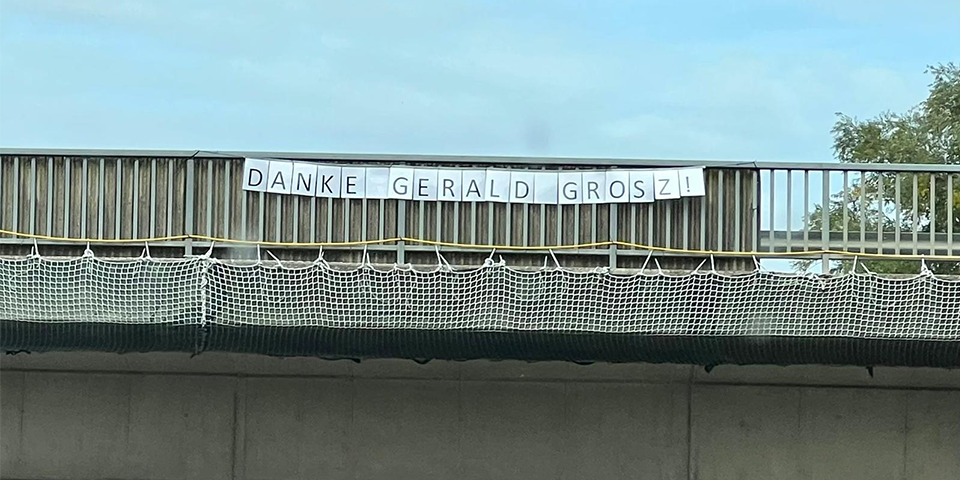 Die Bewohner der Stadt Hartberg bedanken sich mit einem Transparent bei Hofburg-Kandidat Gerald Grosz.
