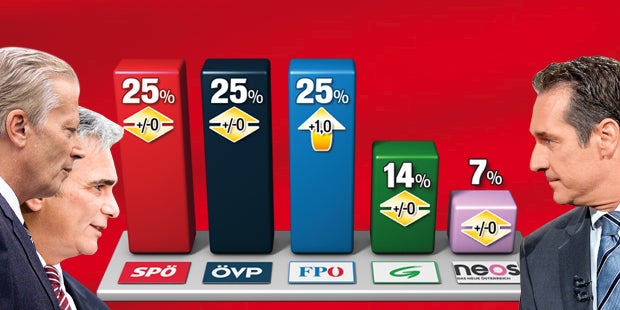 Spannender geht es kaum. Derzeit könnte jede der drei Großparteien eine Wahl gewinnen – wenn denn eine wäre. Die aktuelle Gallup-Umfrage für ÖSTERREICH (400 Befragte vom 11. 11 bis 13. 11. 2014) sieht SPÖ, ÖVP und FPÖ mit jeweils 25 % auf Platz 1. SPÖ und ÖVP liegen damit im Vergleich zur letzten Umfrage unverändert, die FPÖ von Heinz-Christian Strache hat ihren Hänger (wegen Höhlenmenschen, Hitlergruß und Alkohol-Auftritt) augenscheinlich überwunden und kann einen Punkt zulegen.
