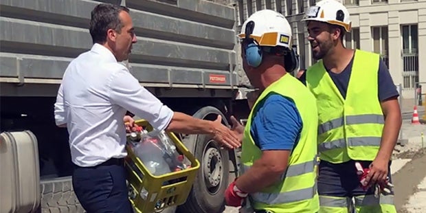 Mit seiner Pizzaboten-Aktion sorgte Bundeskanzler Christian Kern für einige Aufregung und hitzige Diskussionen. Jetzt hat das Bundeskanzleramt ein neues Video veröffentlicht: Es zeigt den Bundeskanzler, wie er Mineralwasser an Bauarbeiter verteilt.