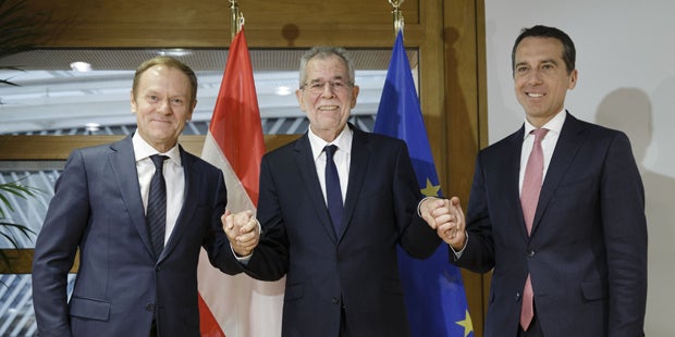 Immerhin hatten Kern und Van der Bellen bei ihrem gestrigen Treffen mit EU-Kommissionspräsident Jean-Claude Juncker und EU-Ratspräsident Donald Tusk vor allem eine Botschaft: „Wir wollen eine starke EU und das gemeinsame Projekt Europa retten.“ Ein klarer Seitenhieb auf den Aufstieg der „Rechtsdemagogen“ und Donald Trump, die vom Zerfall der EU träumen. Juncker bewies augenzwinkernd, dass er auch den Wiener Dialekt beherrscht: „Ich freue mich, mit Kanzler Kern einen Haberer begrüßten zu dürfen.“