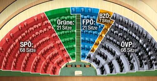 Die neue Sitzordnung ähnelt der alten: Die SPÖ sitzt links, die ÖVP rechts außen. Zwischen den beiden großen Fraktionen sind die kleineren Parteien untergebracht, die ebenfalls im wesentlichen dort Platz nehmen, wo sie schon in den vergangenen vier Jahren saßen: Die Grünen neben der SPÖ, die beiden "freiheitlichen" Fraktionen von FPÖ und BZÖ neben der ÖVP.