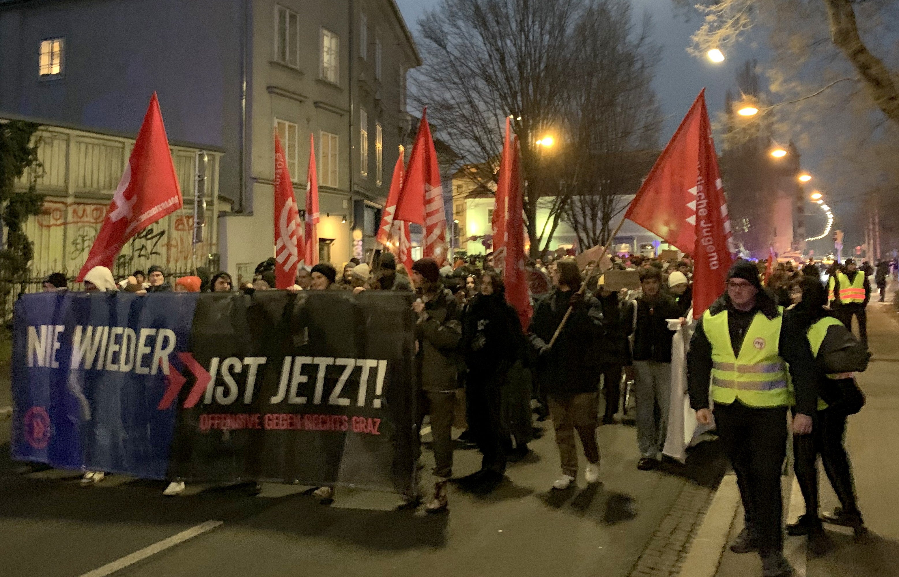 Knapp 1.000 Teilnehmerinnen und Teilnehmer haben am Samstagabend in Graz gegen den 70. Akademikerball und gegen eine blaue Regierungsbeteiligung demonstriert.
