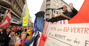 Der Widerstand gegen den EU-Reformvertrag vereint Kräfte, die sich sonst nicht riechen können: Die FPÖ mit Parteichef Heinz Christian Strache wettert ebenso gegen das europäische Vertragswerk wie der Schauspieler Hubsi Kramar, die Schriftsteller Peter Menasse und Marlene Streeruwitz. Letztere beteiligen sich bei der Plattform VolXabstimmung, die am Samstag eine Menschenkette um das Parlament bildet. Sie rufen die (an diesem Tag abwesenden) Abgeordneten dazu auf, eine Volksabstimmung zu ermöglichen.