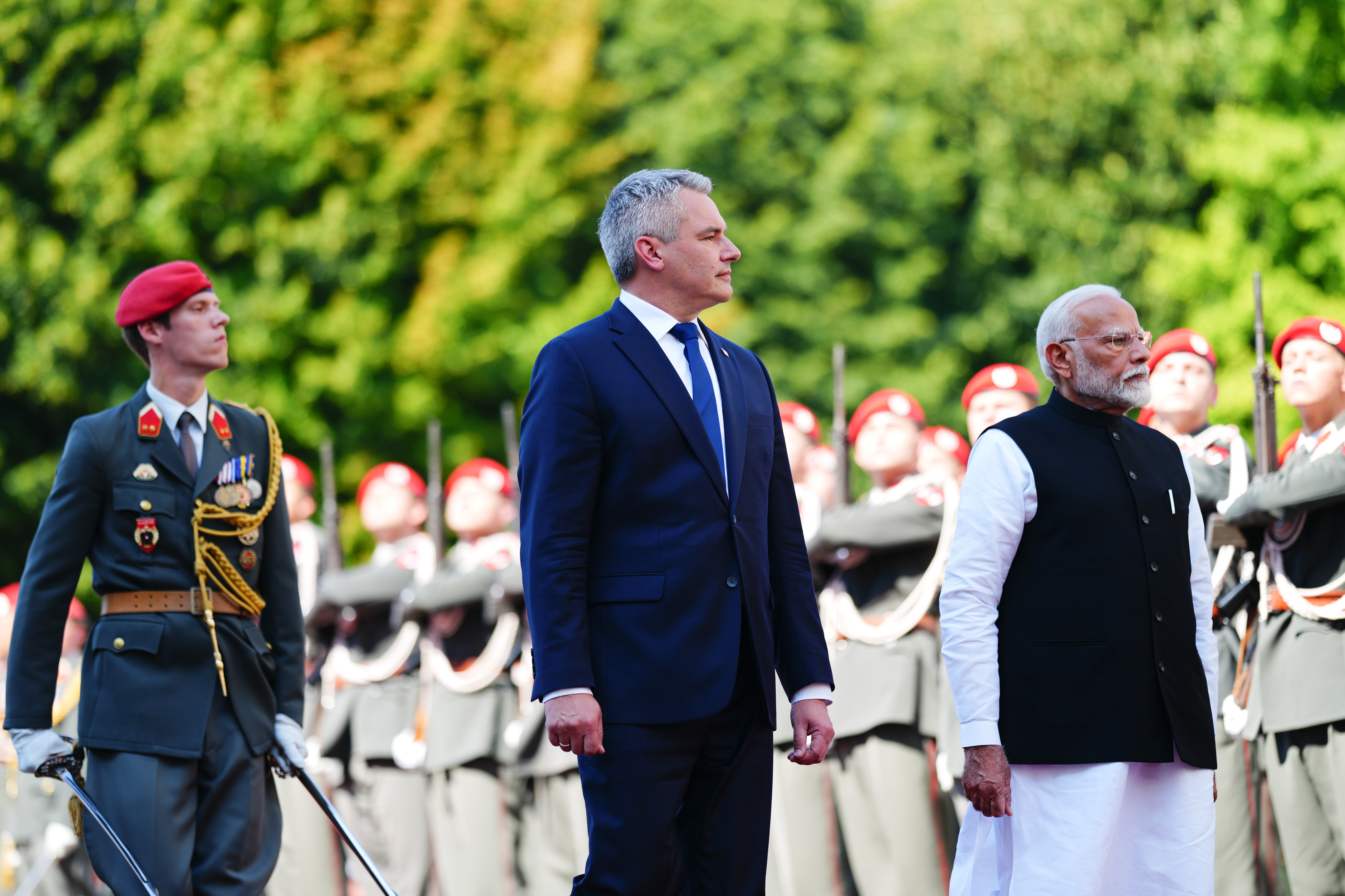 Mit Fanfarenklängen wurde Modis Limousine angekündigt. Kanzler Nehammer nahm ihn in Empfang und schritt mit ihm auf dem roten Teppich vor dem Kanzleramt die Garde ab, deren Musiker die indische und die österreichische Hymne intonierten.