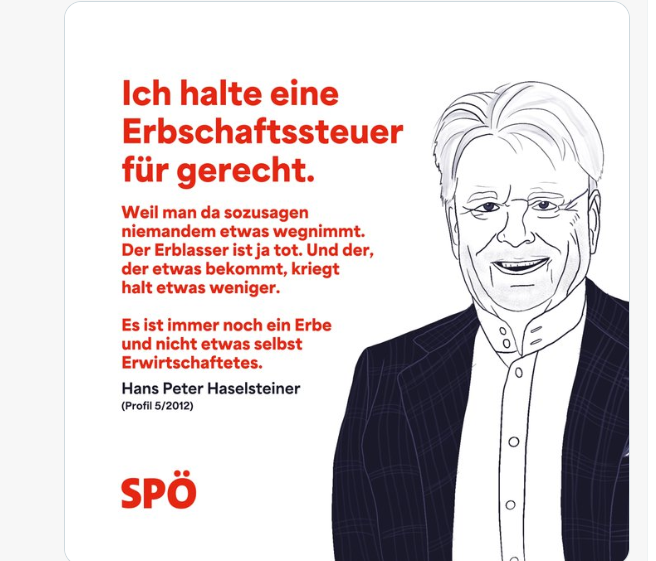 Dazu veröffentlicht die SPÖ auf X folgenden Text: Hans Peter Haselsteiner, einer der reichsten Menschen in Österreich, hält eine Erbschaftssteuer für gerecht. Wir sehen das auch so. Bei unserem neuen Millionärssteuer-Modell sollen lediglich die 2 % Superreichsten ihren gerechten Beitrag leisten. Wir alle profitieren."