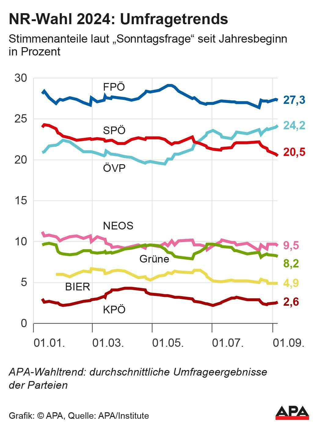 Die ÖVP festigt in den Umfragen zur Nationalratswahl Platz zwei. Im APA-Wahltrend, der Umfragen aus den jeweils vergangenen fünf Wochen berücksichtigt und nach Aktualität gewichtet, erreichte die Kanzlerpartei erstmals im Wahlkampf einen Wert von über 24 Prozent (24,2 Prozent).