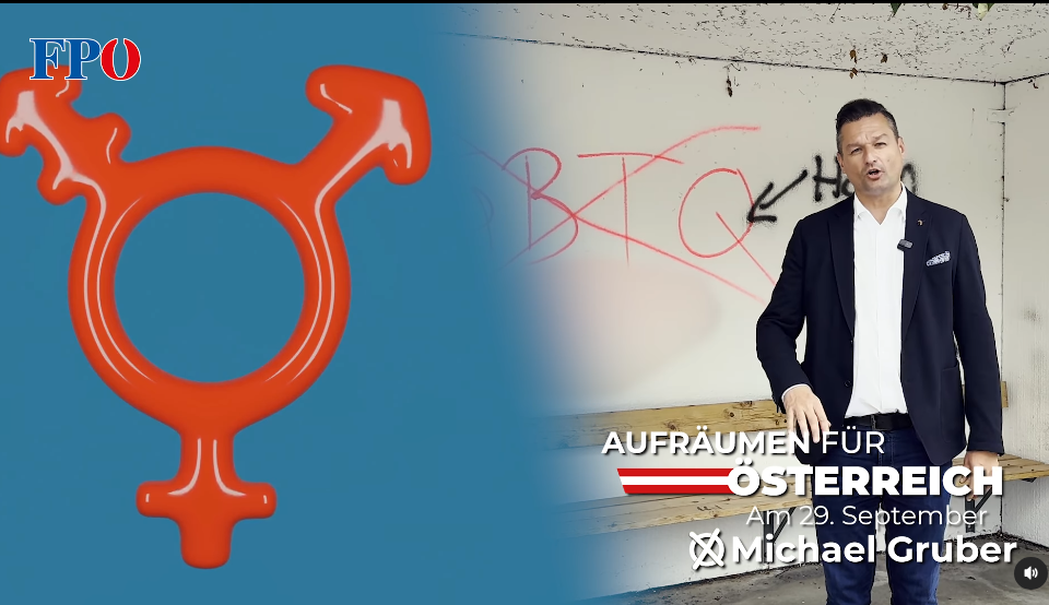 Der Kandidat für den Nationalrat Gruber steht dabei vor durchgestrichenem "LGBTQ"-Schriftzug. Die FPÖ trete an, um "Normalität für unsere Gesellschaft herbeizuführen". Diese Normalität sehe für ihn so aus: "Wir wollen ein Manderl und ein Weiberl und dann gibt's Kinder. Und dann hat unsere Gesellschaft Zukunft".