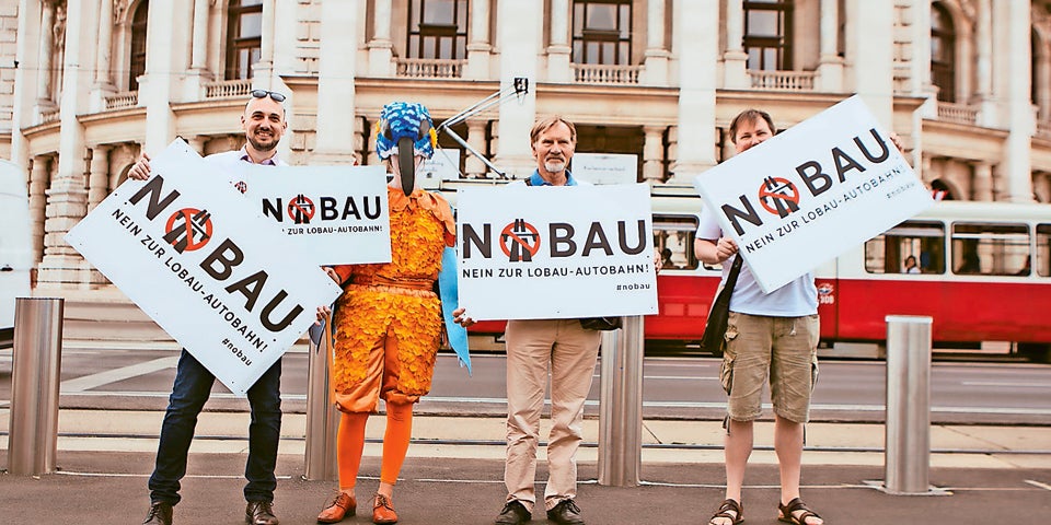 Für Aufsehen sorgt im Donnerstagmorgenverkehr am Ring eine Protestaktion der „Nobau“-Initiative der Wiener Grünen. 60 Personen und ein Eisvogel – das Wappentier des Nationalparks Donau-Auen – machten am Ring gegen den Bau der Lobau-Autobahn Stimmung.