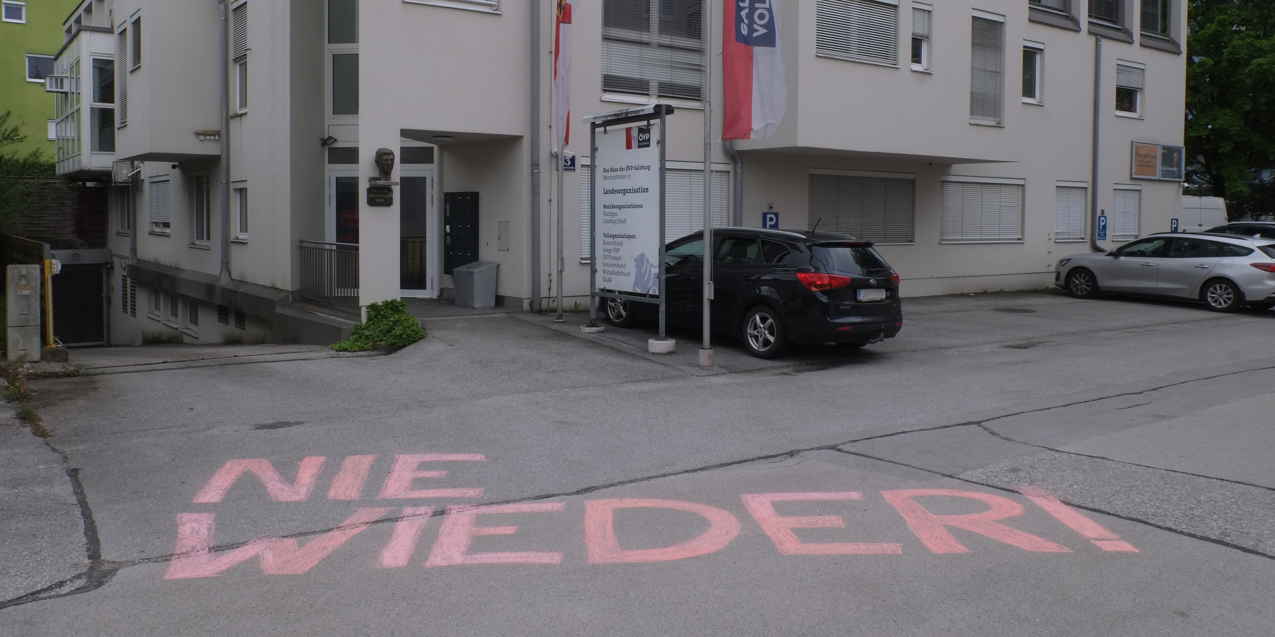 "Nie wieder!", prangte vor der ÖVP-Zentrale auf dem Boden. Das "Nie wieder" des Nationalratspräsidenten Wolfgang Sobotka (ÖVP) beim Mauthausen-Gedenken sah Sarah Lena Schlegel vom antirassistischen Kollektiv "Antira" im Widerspruch zur Koalition "mit einer FPÖ, die nicht nur in der Vergangenheit eine eindeutig fehlende Distanzierung zum Rechtsextremismus bewiesen hat".