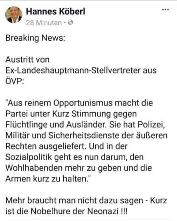 Für Aufregung und heftige Kritik sorgte am Donnerstag ein Posting des Kärntner SPÖ-Politikers Hannes Köberl. Der Gewerkschaftsfunktionär schrieb auf seiner Facebook-Seite: "Kurz ist die Nobelhure der Neonazi"(!). Er bezog sich dabei auf den ausgetretenen ÖVP-Politiker Arno Gasteiger, der kritisiert hatte, dass Kurz "aus reinem Opportunismus Stimmung gegen Flüchtlinge" mache und die Sicherheitsdienste "der äußeren Rechten ausgeliefert" habe.