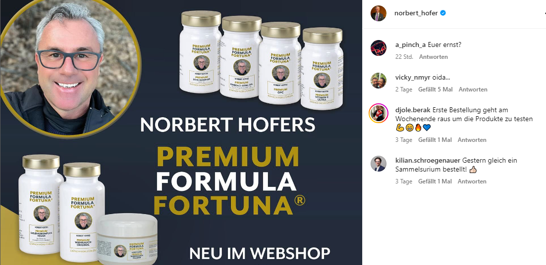 Premium Formula Fortuna heißt das „Wundermittel“ von FPÖ-Politiker Norbert Hofer. Er verspricht „Gesundheit und Wohlbefinden“ durch das Nahrungsergänzungsmittel, das er selber kreiert hat.