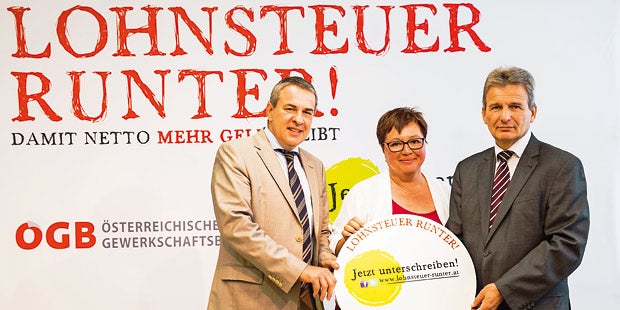 „Wir haben es satt, Lohnverhandlungen nur für das Finanzministerium zu führen“, poltert Erich Foglar, Präsident des Österreichischen Gewerkschaftsbunds (ÖGB). Mit einem einstimmigen Vorstandsbeschluss startet die Gewerkschaft deshalb ihre Kampagne „Lohnsteuer runter!“. Mit einem Budget von knapp zwei Millionen Euro für dieses und nächstes Jahr werden verschiedene Maßnahmen finanziert: