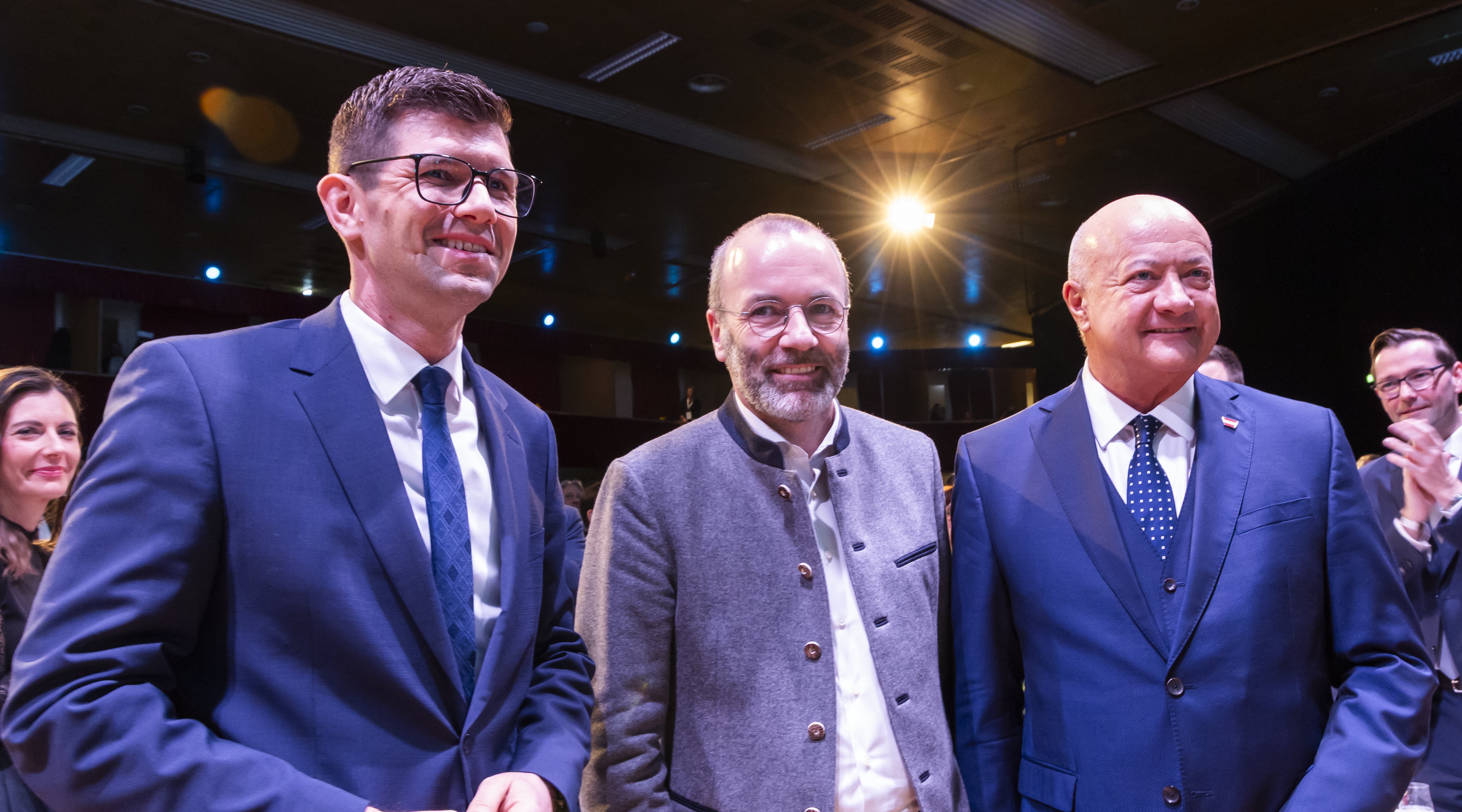 Der Kärntner Landesparteiobmann Martin Gruber (ÖVP), EVP-Parteichef Manfred Weber und Bundesparteiobmann Christian Stocker (ÖVP).